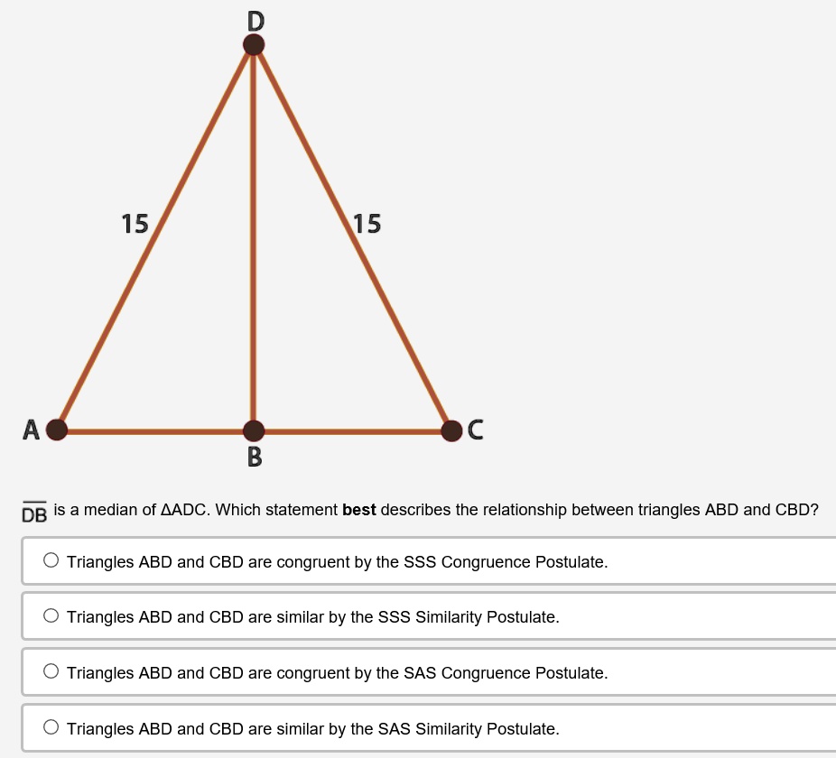 Solved 15 15 A Db E Si Median Of Aadc Which Statement Best Describes The Relationship Between Triangles Abd And Cbd Triangles Abd And Cbd Are Congruent By The Sss Congruence Postulate Triangles