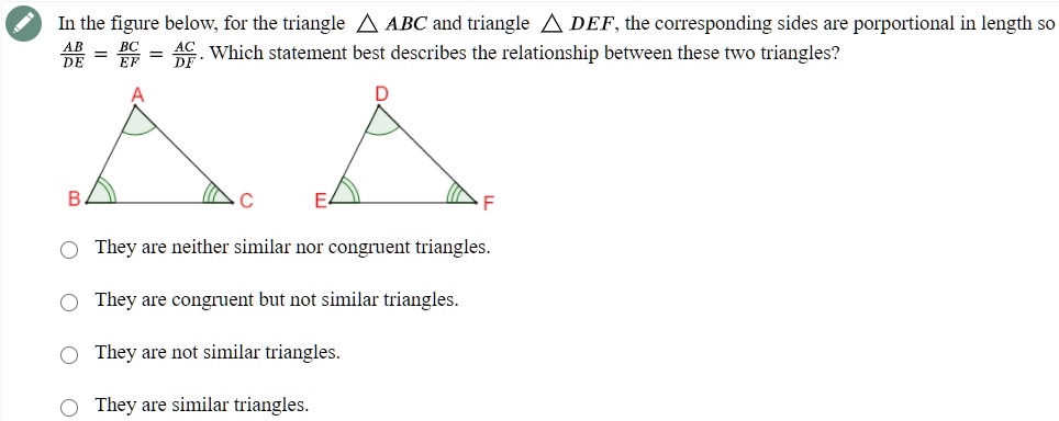 Solved In The Figure Below For The Triangle Abc And Triangle Def The Corresponding Sides Are Porportional In Length So Ae Ec F Which Statement Best Describes The Relationship Between